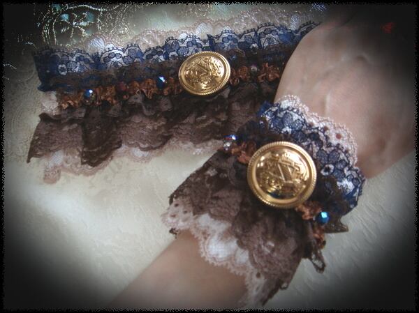 アンティーク調金ボタンとガラスビーズでレトロ感とピンクベージュの組み合わせです。