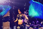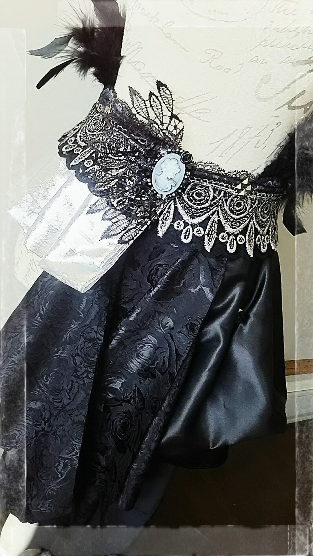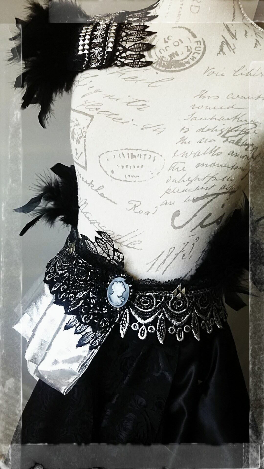 片側はボリュームスカート、バックはロングスカートで靡かせ、ウエストには羽根を踊らせています。
